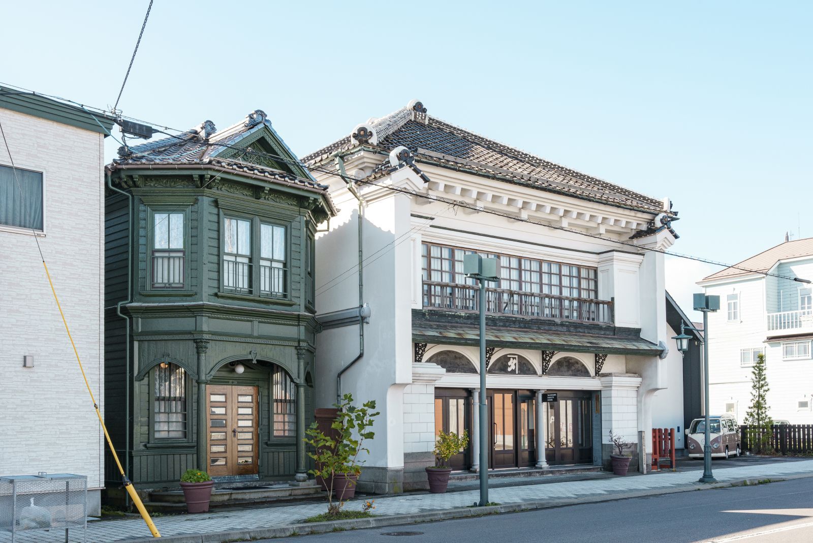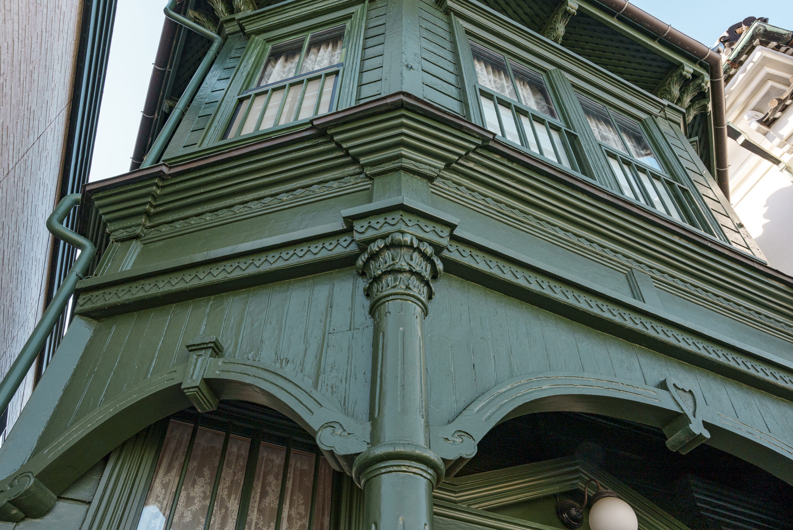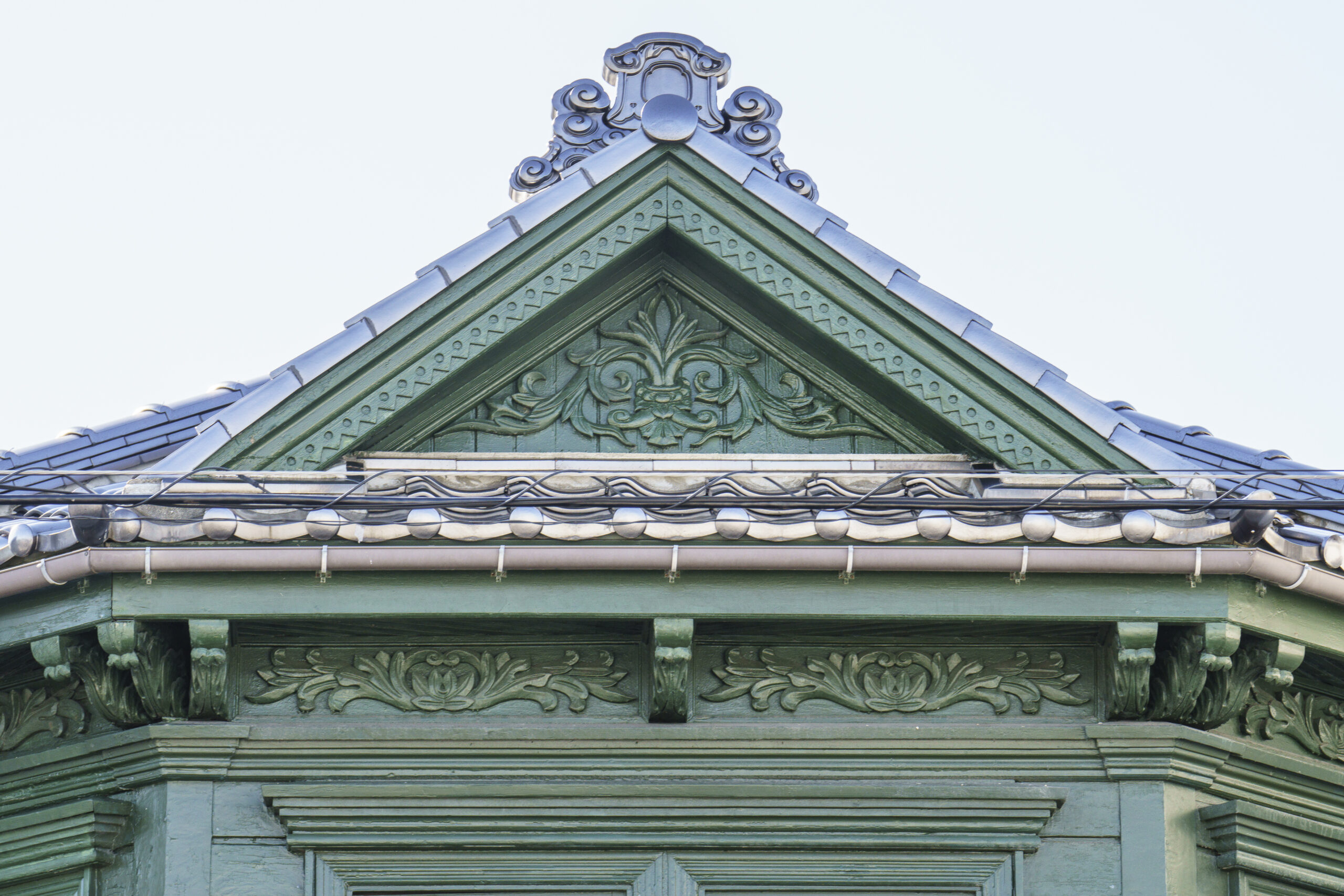 建設は1915(大正4)年。木造2階建て入り母屋(もや)瓦ぶき、若草色の下見板張りによる外壁の仕上げが特徴的だ。破風や軒下に施された彫りの深い植物文様、コリント式円柱が支える函館独特の3連アーチ。隆盛を誇った大正期の函館を代表する建築物の一つである。