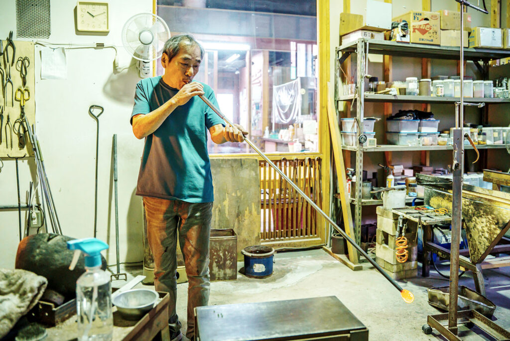 砥部焼で知られる愛媛県の生まれ。大阪のガラス製品製造会社を経て1979年、仲間6人で小樽に「ザ・グラススタジオ」を設立した。職人がガラスを吹いてタンブラーなどの商品を作る姿を客に見せる「工房兼ギャラリー」というスタイルは、当時は斬新なものであった。