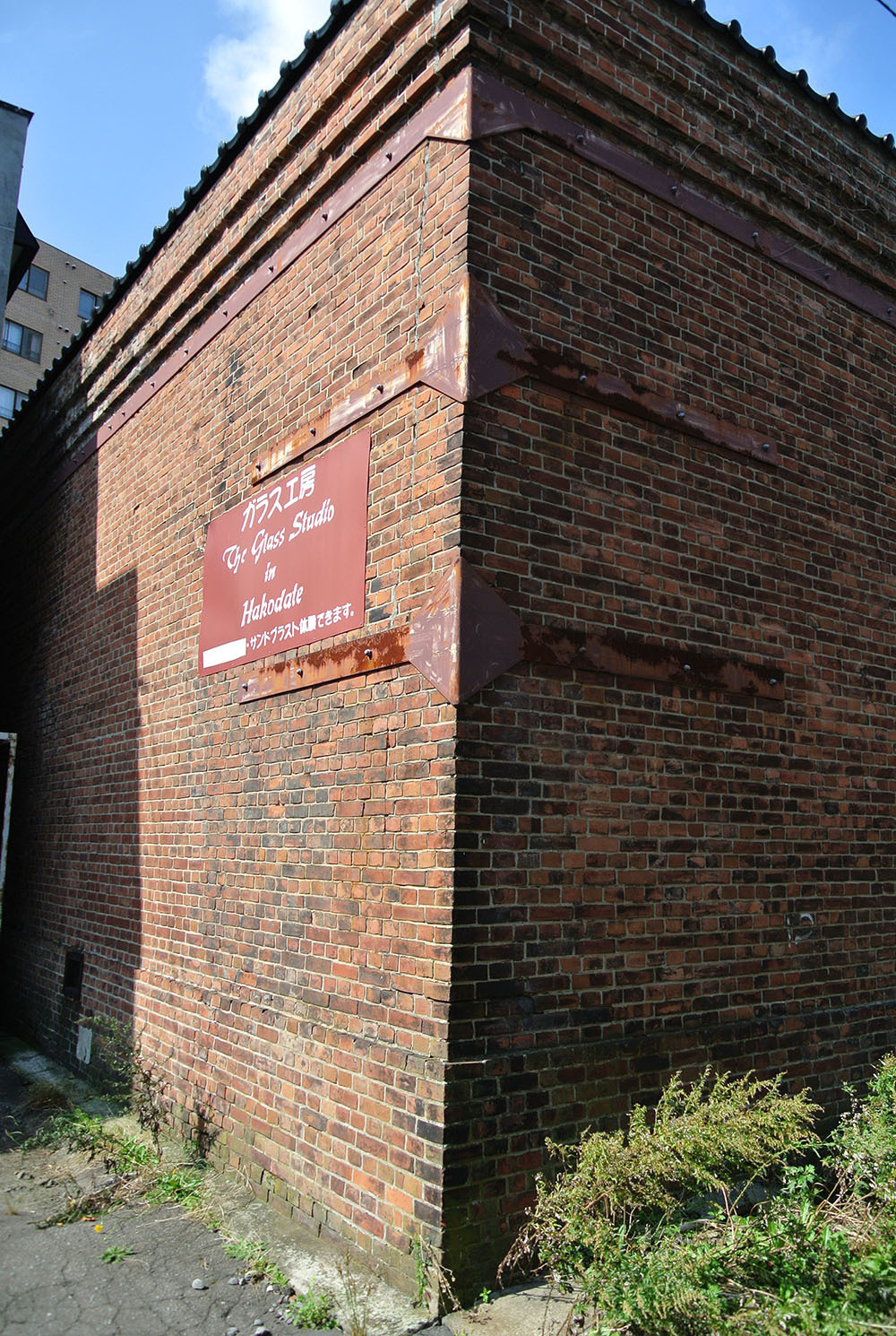 1859(安政6)年に国際貿易港として開港した函館は、三方を海に囲まれ、海からの強風で大火に悩まされてきた。港周辺の倉庫は耐火性が課題であった。中でもれんが造が多用されたのは、海風による塩害への耐久性からだと推察される。1905(明治38)年の日露戦争終結後、函館港は海産物などを保管する重要な基地となる。グラススタジオは、そんな時代の中で建てられたのだ。れんがの長い方向(長手)と短い方向(小口)を一段ずつ交互に積む「オランダ積み」で造られている。