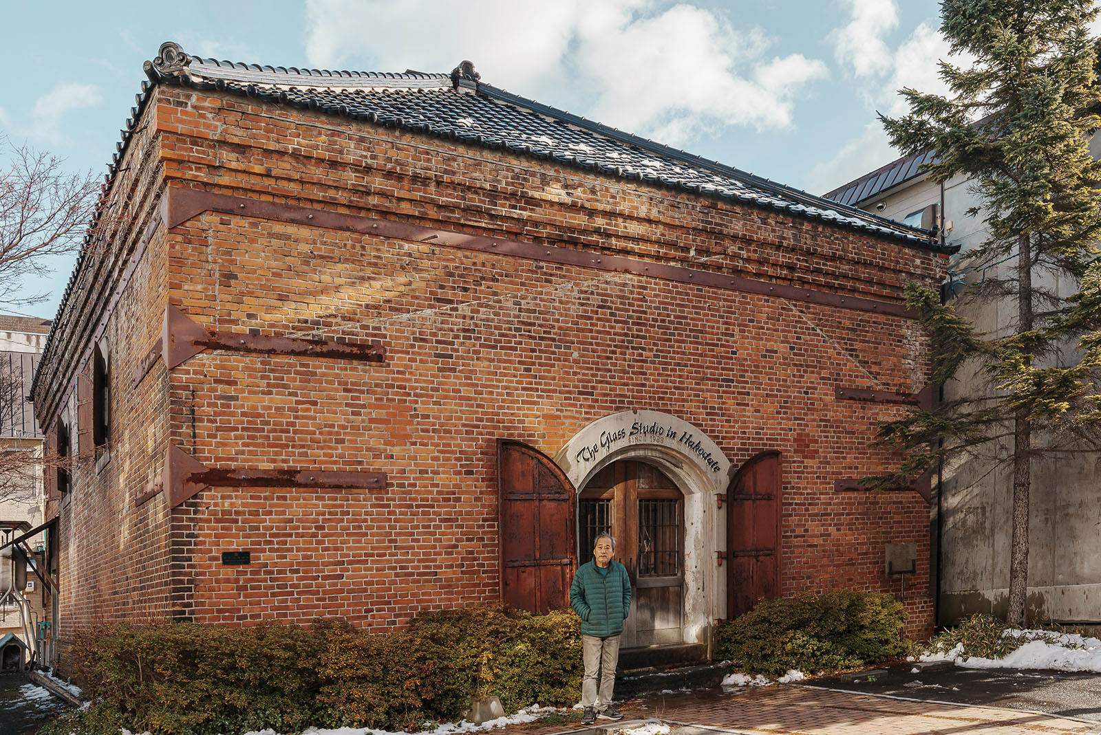 函館ベイエリアの一角で美しいガラス製品を制作・販売する「ザ・グラススタジオイン函館」は、1910(明治43)年に海産商の倉庫として建てられた。れんが造、屋根は瓦ぶきの寄棟造で、軒蛇腹と出入り口のアーチ型が特徴的な洋風建築である。
