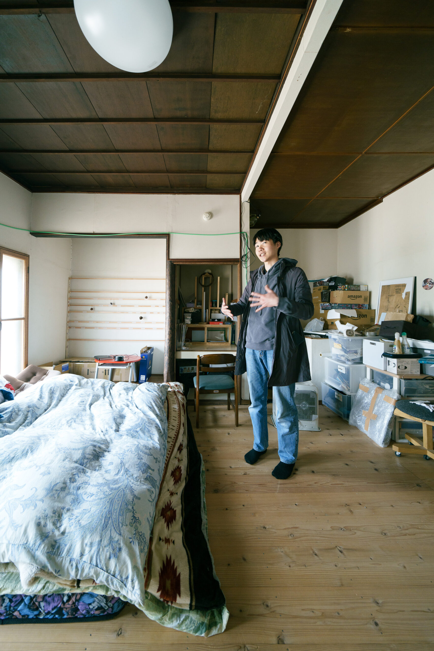 4.改装された2階の一室に住み始めた家具職人の牛嶋堅人。道南杉の床が真新しい。冬場も住めるよう、牛嶋が勤める工房の代表鳥倉真史が中心となって改装を進めている