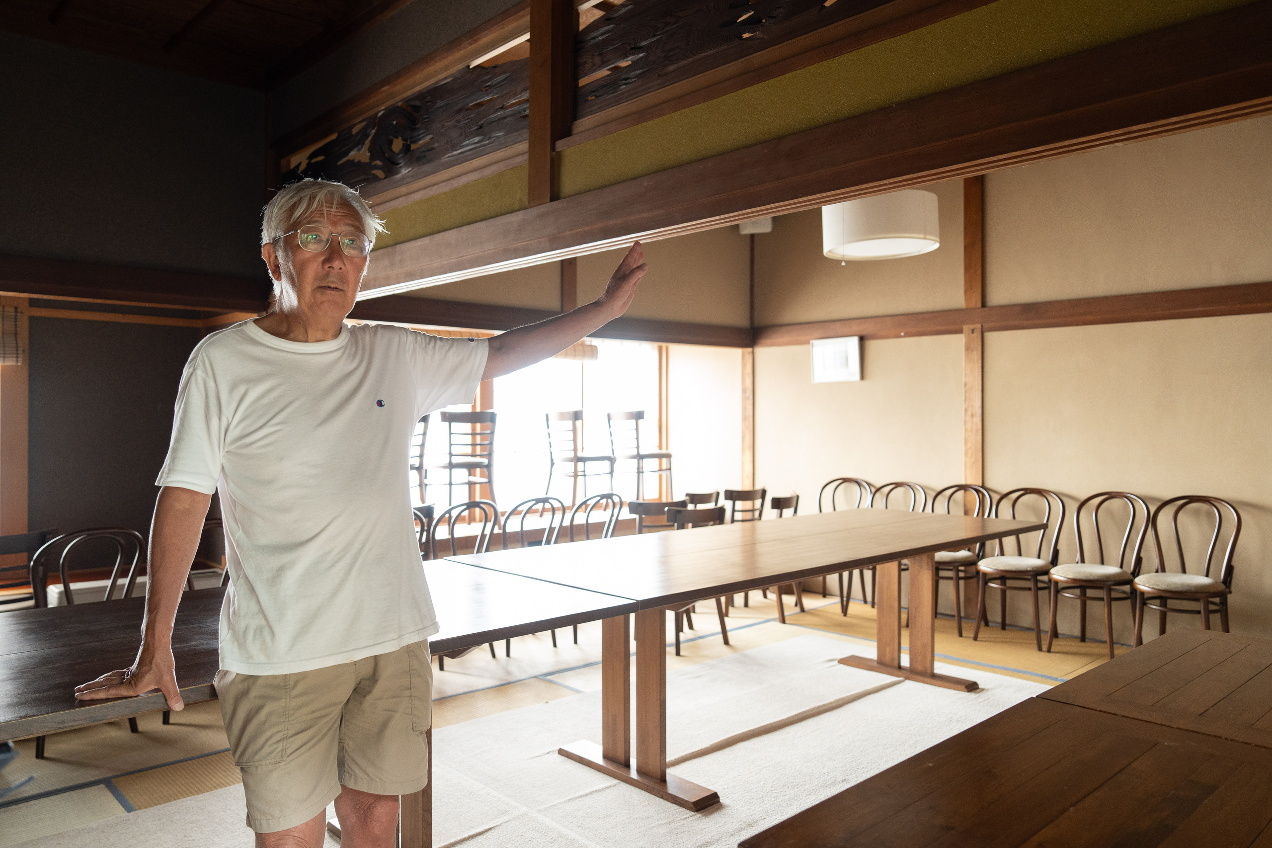 3.1階奥の和室に立つ深谷宏治。かつて自身の一家が暮らしたこの部屋は、団体客が歓談する場となった