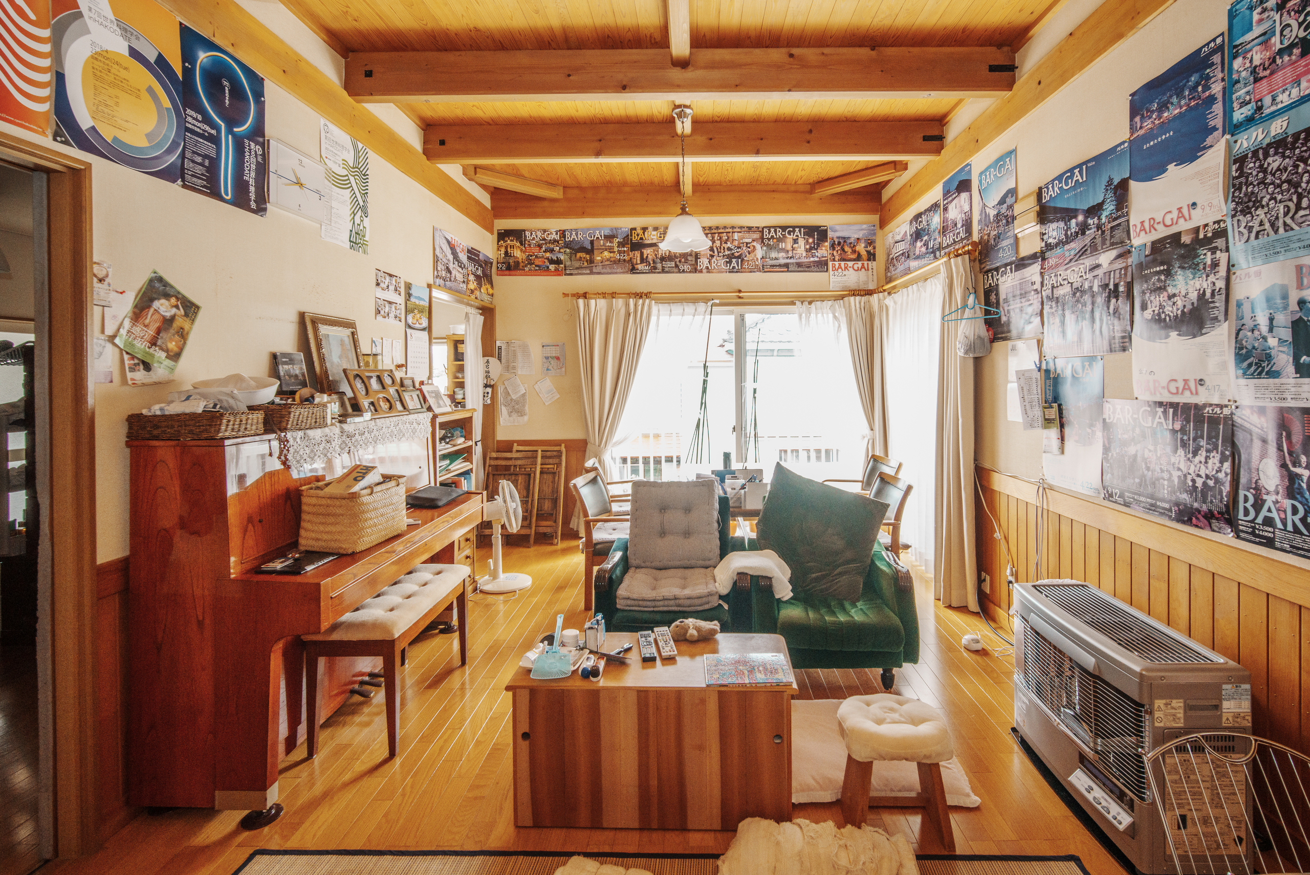 6.「裏2階」に設けたリビングルーム。年2回開く「函館西部地区バル街」のポスターが壁面を彩る
